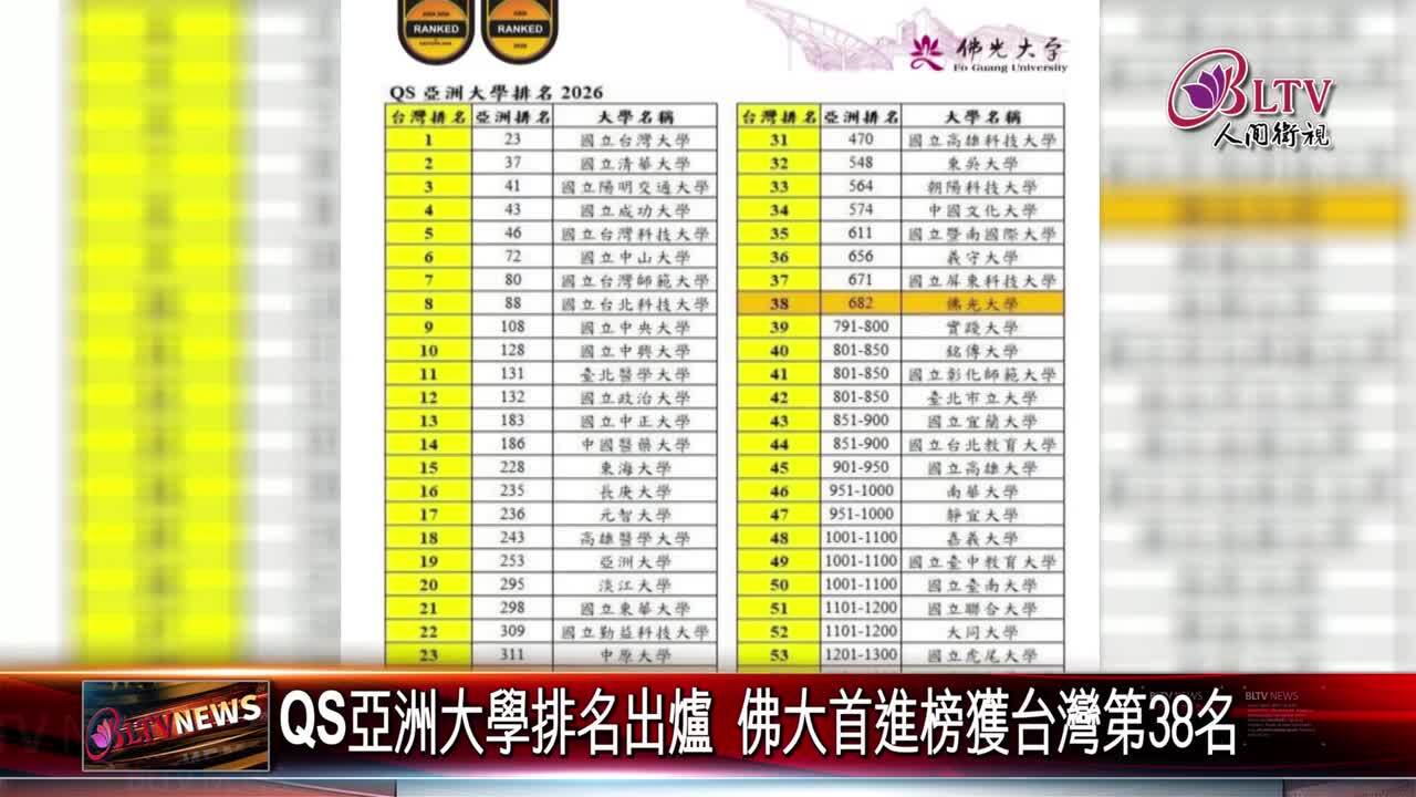 佛光山以教育培養人才,再傳捷報!在佛光大學校長趙涵㨗上任滿一周年之際,國際知名高等教育評比機構QS,公布2026年亞洲大學排名,佛光大學首度進榜,榮獲台灣第38名、東亞第318名、亞洲第682名。而校長趙涵㨗也表示,未來將持續延續創辦人星雲大師的教育願景,提升佛大全球競爭力。 #QS亞洲大學排名 #佛光大學 #以教育培養人才