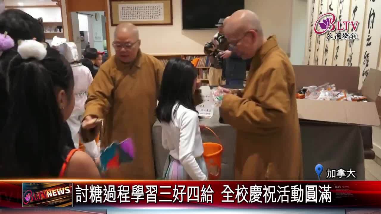 加拿大滿地可的佛光山普門中文學校,充滿孩子的歡笑聲,學校舉辦了融和佛光文化的萬聖節活動,學生們穿著萬聖節服飾參加活動,一邊玩遊戲,一邊學習三好四給精神。 #滿地可普門中文學校 #萬聖節 #討糖 #三好四給