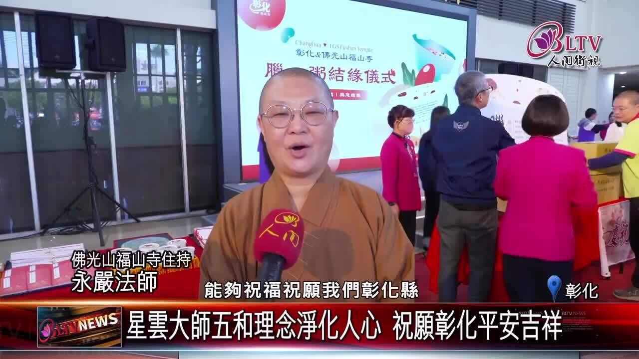 為恭迎農曆12月8日釋迦牟尼佛成道日「法寶節」到來,佛光山福山寺住持永嚴法師,及國際佛光會中華總會副總會長周學文等人,前往彰化縣政府拜訪王惠美縣長,並贈送萬份「臘八粥」予縣府同仁與洽公民眾,期盼在新的一年,縣民都能吉祥如意、平安順遂。